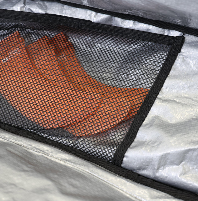 The inside of the bag features multiple net pockets, the side pocket can store wax, fins and small accessories… While the top pocket can store a lycra, poncho or a small towel to protect the nose of your board.